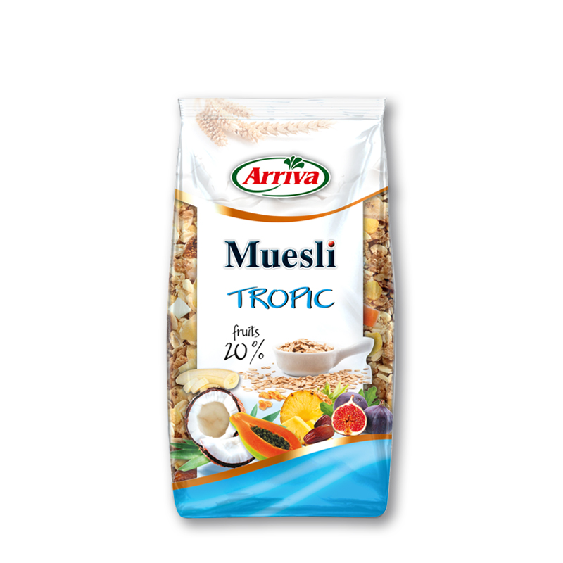 Съставки: пълнозърнести ядки - овесени, пшенични и ръжени, корнфлейкс (царевично брашно, захар, сол, малцов екстракт от ечемик, моноглицериди и диглицериди на мастни киселини), сушени плодове: бананов чипс, папая, смокини, фурми, ананас и кокосов чипс. Съдържа глутен! Може да съдържа следи от сусам, соя, фъстъци и ядки.