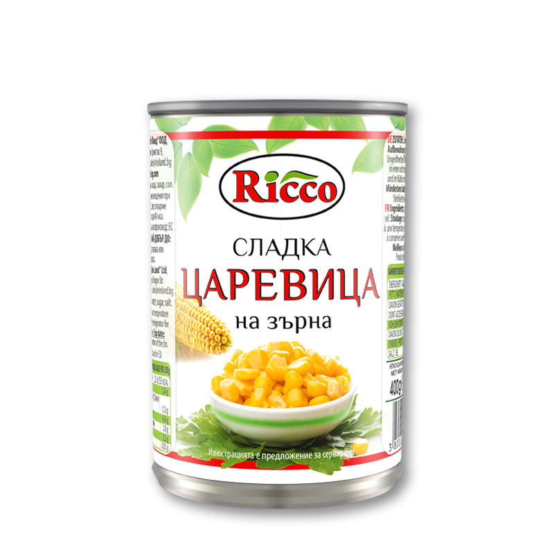 Съставки: Сладка царевица, вода, захар, сол. Стерилизиран продукт.